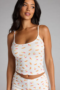 Comfy, cheeky, and made for midnight cravings. This scoop neck pajama top is the perfect mix of lounge-all-day comfort and playful hot dog and condiment print energy! Pair with the matching pajama shorts.