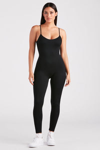 Perfect for coffee runs or chilling this seamless jumpsuit will be the one you reach for! It features a sleeveless scoop neckline, tank shoulder straps, a flirty low back cut, a form-hugging silhouette, and a skinny leg design. The jumpsuit is crafted from seamless rib knit fabric that offers plenty of stretch and comfort. Complete the look in a cozy sweater and your favorite slippers!