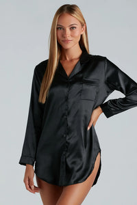 Have yourself the perfect lounge sesh in this silky satin sleep shirt you can't resist! It features long sleeves, a lapel collar neckline, a button-down front, and a relaxed fit for comfortable wear. Complete the look in a matching sleepwear set and fuzzy slippers!