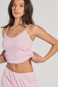 A cute and comfy pajama crop top you'll love sleeping or lounging in! The top is crafted from a dainty pointelle knit fabric with spaghetti straps and a lace trim V-neckline. Complete the look with the matching pajama shorts.