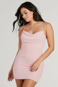 Channel all the glitzy vibes in the Dylan mini dress crafted with clear sequins and gorgeous beading in a glam diamond-shaped design. The short dress features a sleeveless V-neckline with a padded bust for support, adjustable spaghetti straps to find your perfect fit, and a short bodycon silhouette to flaunt your curves.