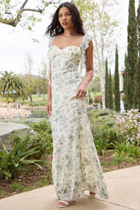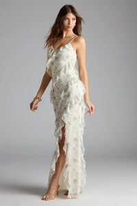 Embrace the beauty of the Melita floral mesh formal dress showcasing flirty ruffled straps, a flattering mermaid silhouette that accentuates your curves, and a chic floor-length hem.