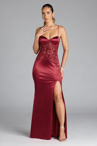 The Felicia satin formal dress is here for your most glamorous events! The dress showcases a stunning sequin and beaded bodice, a high front slit for effortless movement, and a form-hugging silhouette.