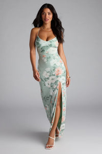 Elevate your style with this stunning floral maxi dress that commands attention. The striking lace-up back adds an alluring touch, while the front slit reveals some skin along the form-hugging silhouette.