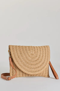 A straw clutch crossbody bag features a detachable wristlet strap, a front flap with snap-button closure, and a detachable shoulder strap for multiple styling options. Perfect for vacation retreats or summer styling.