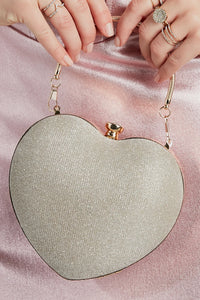 Capture attention at any event with this heart glitter mesh handbag! Made from sparkly glitter mesh material, this handbag features a detachable top handle and chain crossbody strap for versatile wear. The metal trim and top clear gemstone closure add a touch of sophistication, while the spacious satin-lined interior holds all your essentials. Finish the look with a fabulous ring set.