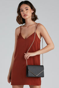 Keep it classy in this faux leather crossbody bag for day-to-night occasions. It features an envelope flap with snap closure and metal trim, a detachable chain-link strap, and one interior pocket. Complete your look with a sleek blazer and heels.