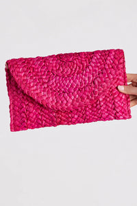 Accessorize all your summer looks with this straw clutch for a perfect casual-chic vibe. It features a rectangular shape, a curved fold-over design, and is composed of a braided straw material. Style with an adorable matching set.