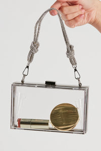 Show everyone your new favorite handbag! It features a clear box-shape design, a rhinestone handle, push-lock closure, and a detachable chain link strap. Complete the look in rhinestone heels for a social occasion!
