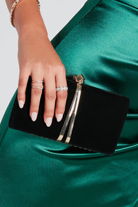 Capture all the compliments by styling your dressy looks with this luxe velvet box clutch! It features a rectangular-shaped design, a knotted detail metal top clasp closure, sleek metal bar center accents, and a smooth velvet exterior. Includes an attachable long chain-link strap to convert the clutch to a crossbody purse. Pair with a gemstone necklace and earrings set for a glam affair!