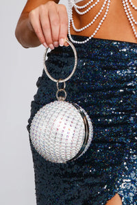 Showcase luxe radiance with this stunning embellished clutch. It features a sphere shape, a netted design with all-over iridescent rhinestones, and a rhinestone adorned O-ring handle. Complete the look with sparkly stud earrings.