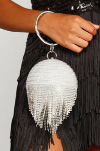Channel vintage glamour by accessorizing with this gorgeous clutch! It features a sphere-shaped design with cascading rhinestone fringe, pearl accents, includes a rhinestone-adorned O-ring handle, and a chain shoulder strap to convert the bag to a crossbody. Complete your look with a sleek little black dress and strappy heels.