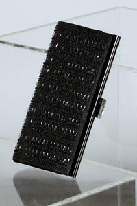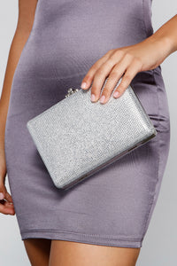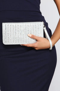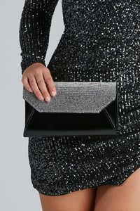 Bring the luxe with a sleek clutch! The clutch features a small rectangular body, a fold-over closure, mini rhinestones throughout, and a wristlet strap. Complete look with an LBD and heels.