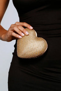 Fall in love with the sparkling details of this embellished heart-shaped clutch. It features a rhinestone mesh design, a top heart-shaped button closure, and includes a detachable chain-link shoulder strap. Style this clutch with cascading duster earrings and a chic ring set.