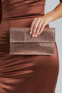 Strike a pose with this glam clutch that elevates your look! The clutch features a rectangular body, fold-over closure, a rhinestone embellished body, and a dainty chain shoulder strap. Complete look with a satin mini dress and heels.