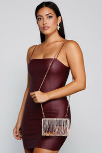 Bring the sparkle to your party look with this trendy clutch that showcases chic and glamorous vibes. It features a rectangular-shaped box clutch design with rhinestone fringe detailing and an included chain shoulder strap. The clutch is composed of a clear acrylic material. Style it with strappy heels.