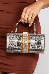 Hey, high roller! Let this clutch elevate your outfits. The clutch features a rounded cylinder body, a top handle, a money print design, rhinestones, and a dainty chain shoulder strap. Complete look with a ruched dress and mules.