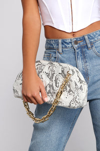 Bring those fierce vibes to your stylish look with this snake print statement clutch. It features a scrunched design with a wide snap top closure, a chunky acrylic chain, a removable shoulder strap, and a woven interior with a single pocket. The exterior is composed of a brushed faux suede with an all-over snake print. Pair this chic clutch with your everyday 'fit and accessorize with a pair of new earrings.