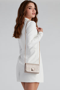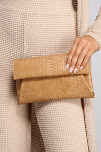 Bring a hint of shimmer to your look with a sleek clutch that adds that finishing touch. The clutch features a small rectangular body, a fold-over closure, a faux snake print body with a shimmer finish, and a dainty chain-link shoulder strap. Complete look with a cute matching set and heels.