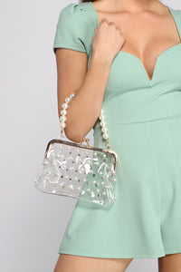 Give your everyday outfit major chic vibes with this stunning clear clutch. It features a clear design with a top metal clasp closure, a pearl handle, and all-over pearl embellishment. Pair this clutch with a casual dress and heeled mules.