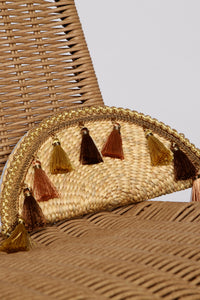 Fun and flirty! This dome-shaped clutch has a straw exterior and multi-colored tassel details with a zipper closure. Complete look with a ribbed mini dress and sunnies.