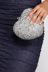 Bring the bling with this glamorous glitter mesh clutch! It features a rectangular shape with a glitter mesh material, a silver metal trim, a rhinestone embellished ring clasp closure that you can wear on your finger to easily carry, and an included silver metal chain to convert the clutch to a crossbody purse. Style this clutch with rhinestone statement earrings and new heels.