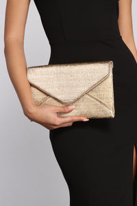 Accessorize with this gorgeous metallic clutch to get those glamorous vibes. It features an envelope design with a fold-over closure and includes a metal chain to convert the clutch to a crossbody. The bag is composed of a shimmery metallic faux leather material. Pair this chic clutch with your fave little black dress and clear heels.