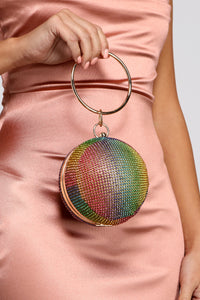 Keep it colorful with this sparkling sphere clutch that brings the sparkle to your look! The one-of-a-kind clutch features a sphere design, a multi-hued rhinestone embellished body, and a sleek O-ring handle. Complete your glitzy look with a velvet dress and rhinestone cuff.