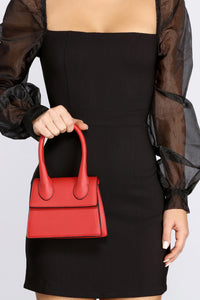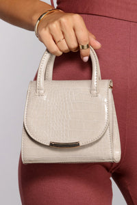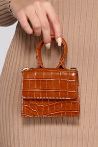 This mini purse is not for a basic babe, show off your affinity for the extra life in true fashionista fashion. The purse features a top handle, a fold-over closure, and a faux croc-embossed pattern throughout. Complete look with a chic mini dress and strappy mules to make a stunning statement.