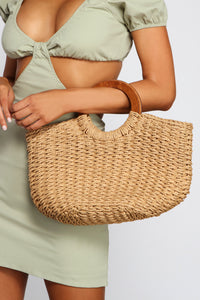 You'll be totally ready for your next beach trip with this adorable straw tote. It features a woven design with dual wooden O-ring handles. Style this bag with sandals and cute shades.