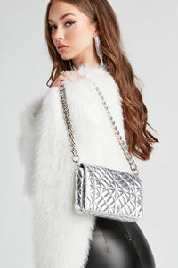 Let your outfit stand out by accessorizing with this metallic shoulder bag featuring a quilted design, a foldover front with snap button closure, and dual chain link straps. Complete the look in a faux fur jacket.