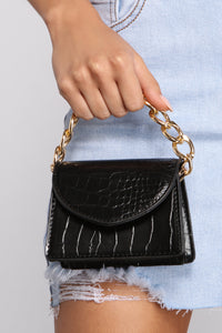 Showcase how extra you are with this mini purse that creates a diva-moment! The mini purse features a mini-rectangular design, a fold-over closure with a snap button, a chunky chain-link handle, a croc-embossed body, and a detachable chain shoulder strap. Complete look with a ruched mini dress.