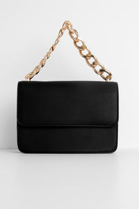 Bring major shine to your look with a crossbody that is oh so luxe! The crossbody features a small rectangular design, a top fasten closure, rhinestones, and a detachable chain-link shoulder strap. Complete look with a black dress and a choker.