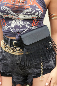 Accessorize your summertime outfits with this trendy faux leather fanny pack! It features a rectangular shape with a fold-over design and fringe detailing. The fanny pack comes with a faux leather belt to attach to, as well as a thin gold metal chain to convert it to a stylish crossbody purse. Style this fanny pack your fave pair of cutoff denim shorts.