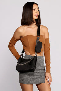 Turn on your swag with this must-have shoulder bag! The bag features a small rectangular nylon body, a detachable swag chain accent, a textured woven nylon shoulder strap, and a small pouch on the shoulder. Complete look with matching separates to create a trendy streetwear look.