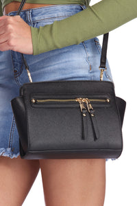 This zip front crossbody satchel is the perfect accessory for all your looks! It features a rectangular design with zippered pockets on both sides, a zippered top with multiple pockets on the lined interior, and an adjustable detachable shoulder strap. Bag is composed of a black faux leather material.