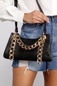 Wondering how to amp up your purse game? Throw in some crocodile print of course! This purse features a flap front closure with a cross body chain link strap. It is composed of a faux leather material with a crocodile texture. We love!