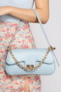 Fall for this chic shoulder bag that keeps your look lovely and chic! The shoulder bag features a rectangular body, a fold-over closure with a turn-lock fasten, a chunky chain link accent, and a shoulder strap. The handbag is composed of a faux leather material. Complete look with a bodysuit and duster.