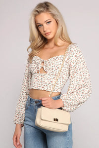 Set the bar with a trendy crossbody that stuns! The crossbody features a snake print, a small rectangular body, a fold-over closure with a snap button, a top handle, a chunky chain link accent, and a chunky chain link with a faux leather shoulder strap. Complete look with a black bodysuit and distressed jeans.