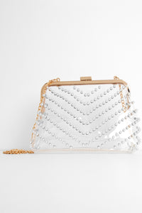 Give a little twirl with pearl bby! This adorable clutch gives us romantic soft glam vibes, and we are all for it. Interchangeable from a pearl handle to a chain link shoulder strap makes it a night out must have!