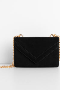 Complete your simply stunning look! This envelope style purse is designed with a structured rectangular body, an double envelope closure, and a gold link chain strap. Composed of a faux suede material.Style Number/Barcode: 07203-0123