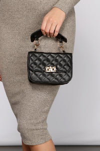 Keep it chic with a cute mini purse to keep all your essentials close to you. The purse features a quilted diamond design, a top handle, a fold-over closure with a turn-lock accent. Complete look with a long sleeve dress.