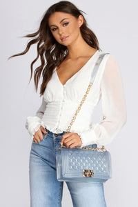 Keep it so glam with a chic handbag that elevates your outfits! The handbag features a faux leather body, a quilted chevron design, a fold-over closure, and a large rounded body. Complete look with a floral blouse and a mini skirt.