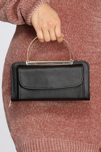 Strike a timeless impression with a faux leather wristlet that features a small envelope-shaped body, fold-over closure with metal trim, and a faux leather wrist strap. Complete your look with a long-sleeved blouse and midi skirt.