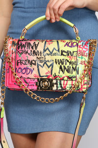 Keep it part chic, part edgy with a crossbody that shows off your fierce style! The crossbody features a top handle, a rectangular body, a fold-over closure with turn-lock closure, a multi neon-hue, a graffiti design, a chunky chain link accent, and an adjustable shoulder strap. Complete look with a denim dress and mules.