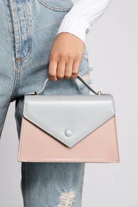 Give off major chic vibes with this adorable top handle bag. It features a fold-over closure, a removable and adjustable shoulder strap, and a two-tone design in neutral gray and blush hues. Pair this bag with a cropped cardigan and mom jeans.