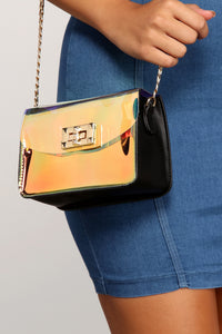 Show off your funky side with a holographic clutch! This piece is rectangle, structured, and has a studded turn lock closure. Purse is composed of a shiny transparent holographic material, back and sides are composed of a faux leather. Purse includes an attached chain and faux leather strap, as well as a detachable small faux leather wallet.