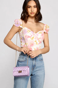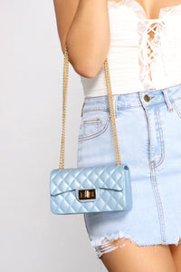 Give your look a little luxe vibe with a crossbody that elevates your look! The crossbody features a small rectangular design, a fold-over closure with a turn-lock fastening, a quilted diamond design, and a chain shoulder strap. Complete look with a corset and mini skirt.
