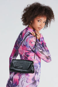 The sleek design of this croc-embossed shoulder bag makes it a chic staple for the season! It features a flat rectangular envelope shape with a fold-over design and snap-button closure, a thin shoulder strap, and a chic croc-embossed pattern on the faux leather material. Style with hoop earrings and strappy mules for an elevated everyday vibe.