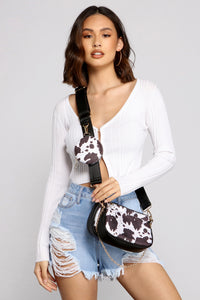 Go trendy and chic with a crossbody that makes a perfect statement piece to your outfit! The crossbodys features a cow print with a small rectangular body, top zipper closures, and a faux leather straps with a detachable pouch. Complete look with a tie front top and cutoff shorts.